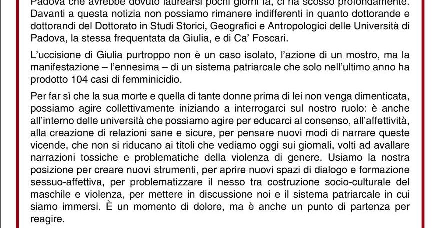 Comunicato delle dottorande e dei dottorandi dei cicli 36°, 37°, 38°, 39° del dottorato in Studi Storici, Geografici e Antropologici dell’Università degli Studi di Padova e Ca’ Foscari di Venezia Il femminicidio di Giulia Cecchettin, studentessa ventiduenne dell’università di Padova che avrebbe dovuto laurearsi pochi giorni fa, ci ha scosso profondamente. Davanti a questa notizia