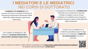 Le mediatrici e i mediatori accademici, nominati all’interno dei corsi di dottorato, hanno il compito di dare sostegno e ascoltare le dottorande e i dottorandi che riportino problematiche relazionali durante il loro percorso dottorale, proponendo eventuali soluzioni.